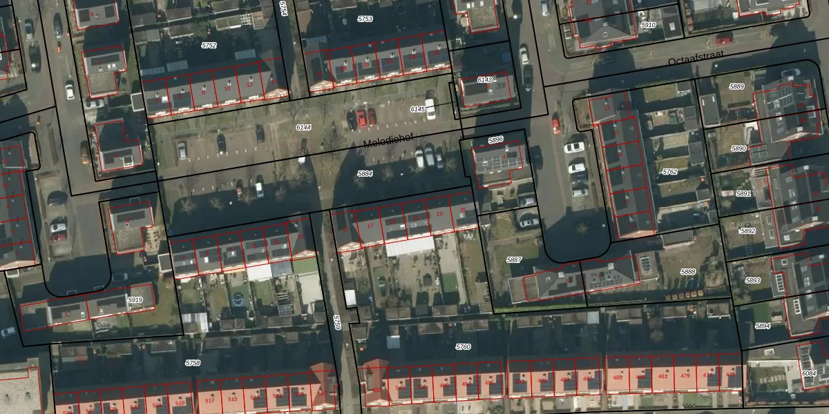 Het perceel waarop Melodiehof 21 staat heeft een oppervlakte van 3360 m². Dit is een zeer groot perceel. De perceeloppervlakte wordt geregistreerd door het Kadaster. Gedetailleerde informatie over de maten van dit perceel kunt u vinden in het rapport Kadastrale kaart met maatvoering van Melodiehof 21.