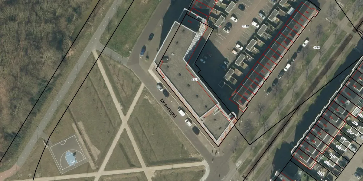 Het perceel waarop Mosasingel 31 staat heeft een oppervlakte van 1322 m². Dit is een zeer groot perceel. De perceeloppervlakte wordt geregistreerd door het Kadaster. Gedetailleerde informatie over de maten van dit perceel kunt u vinden in het rapport Kadastrale kaart met maatvoering van Mosasingel 31.