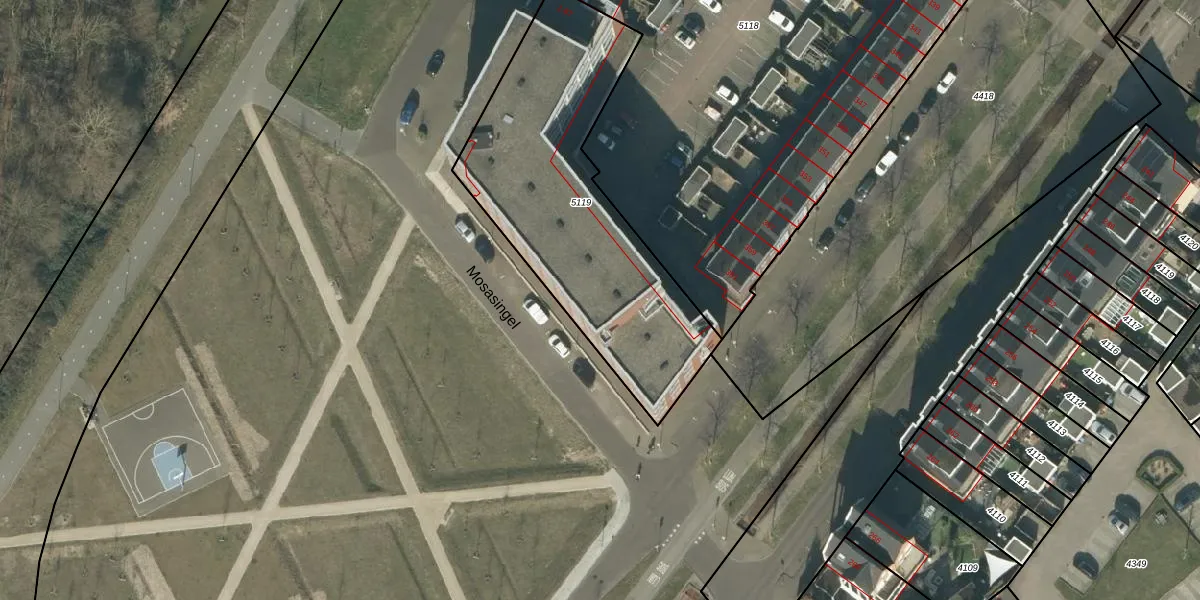 Mosasingel 45 is gelegen op kadastraal perceel RML00I5119. Deze kadastrale aanduiding is uniek en wordt gebruikt door het Kadaster om eigendomsrechten en andere zakelijke rechten vast te leggen. Het perceel maakt onderdeel uit van de kadastrale gemeente Rosmalen.