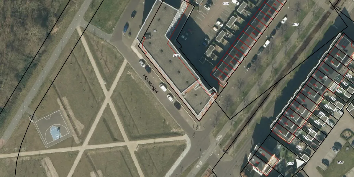 Het perceel waarop Mosasingel 7 staat heeft een oppervlakte van 1322 m². Dit is een zeer groot perceel. De perceeloppervlakte wordt geregistreerd door het Kadaster. Gedetailleerde informatie over de maten van dit perceel kunt u vinden in het rapport Kadastrale kaart met maatvoering van Mosasingel 7.