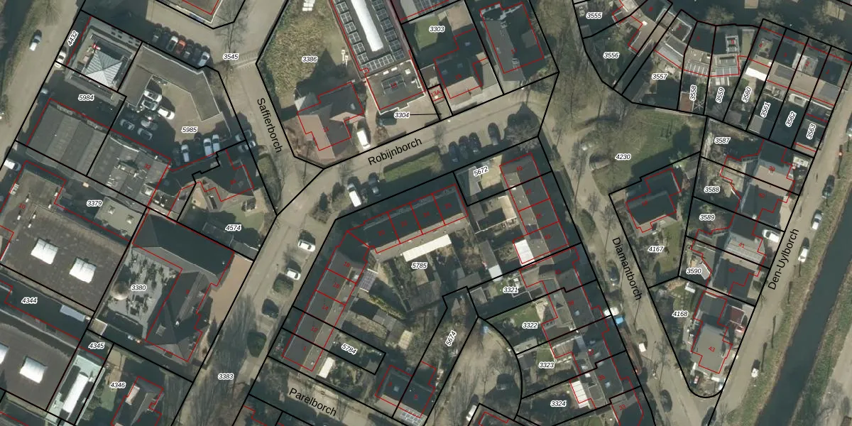 Het perceel waarop Robijnborch 24 staat heeft een oppervlakte van 1905 m². Dit is een zeer groot perceel. De perceeloppervlakte wordt geregistreerd door het Kadaster. Gedetailleerde informatie over de maten van dit perceel kunt u vinden in het rapport Kadastrale kaart met maatvoering van Robijnborch 24.