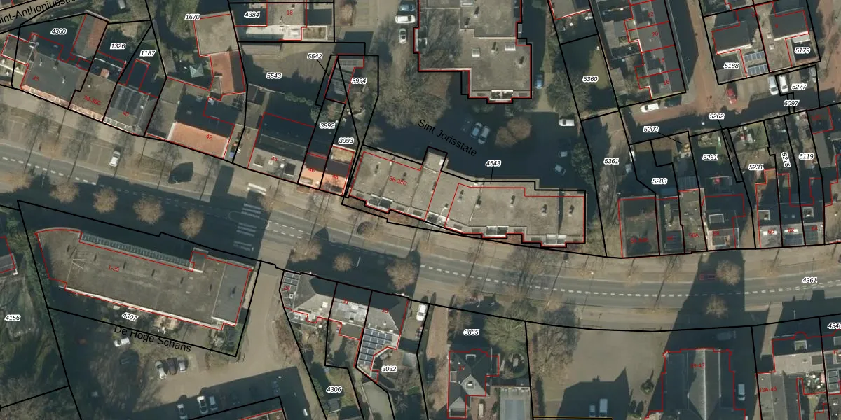 Het perceel waarop Sint Jorisstate 21 staat heeft een oppervlakte van 760 m². Dit is een groot perceel. De perceeloppervlakte wordt geregistreerd door het Kadaster. Gedetailleerde informatie over de maten van dit perceel kunt u vinden in het rapport Kadastrale kaart met maatvoering van Sint Jorisstate 21.