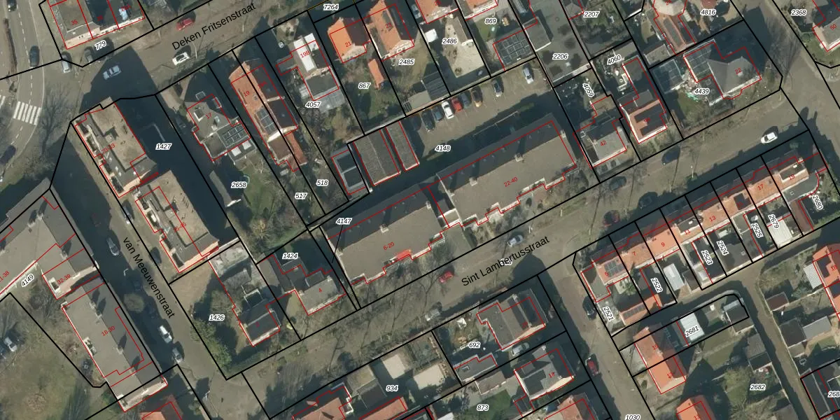 Het perceel waarop Sint Lambertusstraat 20 staat heeft een oppervlakte van 2117 m². Dit is een zeer groot perceel. De perceeloppervlakte wordt geregistreerd door het Kadaster. Gedetailleerde informatie over de maten van dit perceel kunt u vinden in het rapport Kadastrale kaart met maatvoering van Sint Lambertusstraat 20.