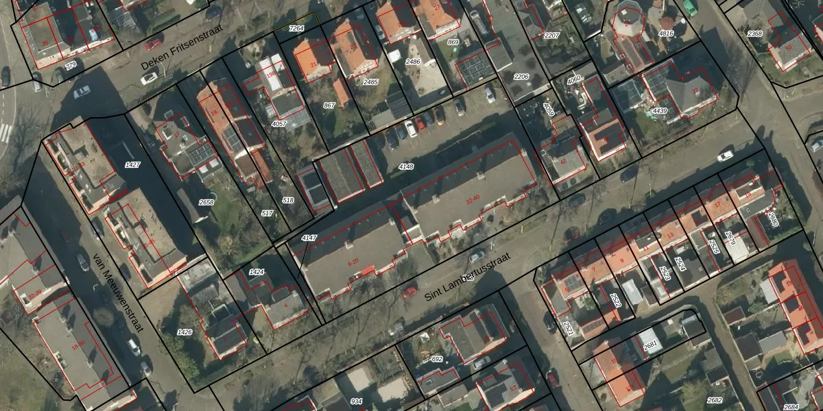 Het perceel waarop Sint Lambertusstraat 32 staat heeft een oppervlakte van 2117 m². Dit is een zeer groot perceel. De perceeloppervlakte wordt geregistreerd door het Kadaster. Gedetailleerde informatie over de maten van dit perceel kunt u vinden in het rapport Kadastrale kaart met maatvoering van Sint Lambertusstraat 32.