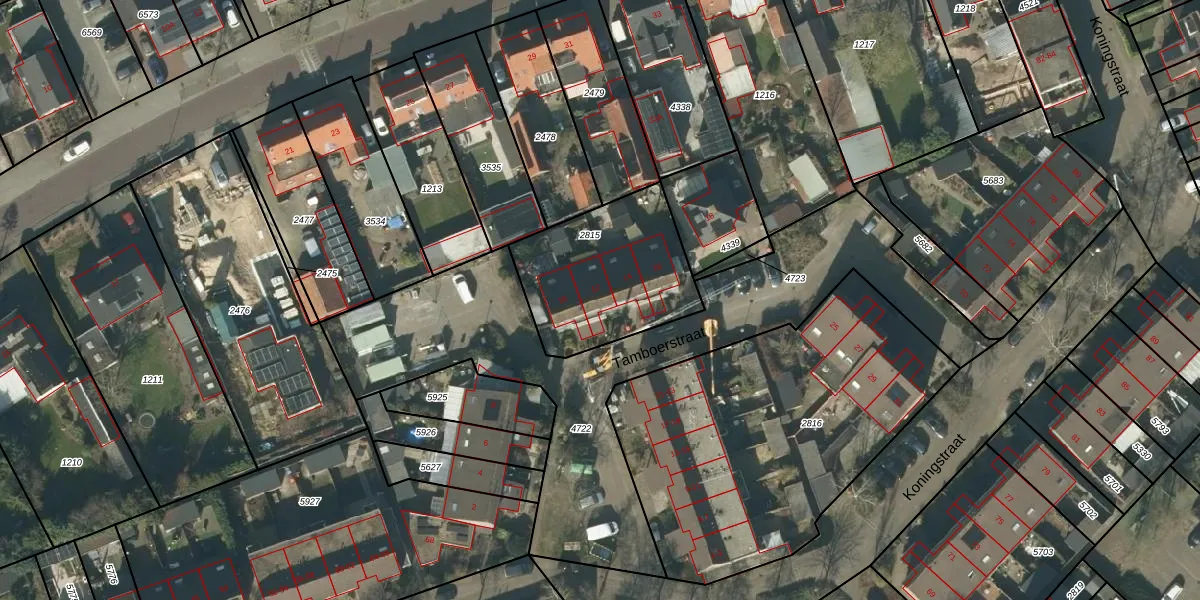 Het perceel waarop Tamboerstraat 12 staat heeft een oppervlakte van 607 m². Dit is een groot perceel. De perceeloppervlakte wordt geregistreerd door het Kadaster. Gedetailleerde informatie over de maten van dit perceel kunt u vinden in het rapport Kadastrale kaart met maatvoering van Tamboerstraat 12.