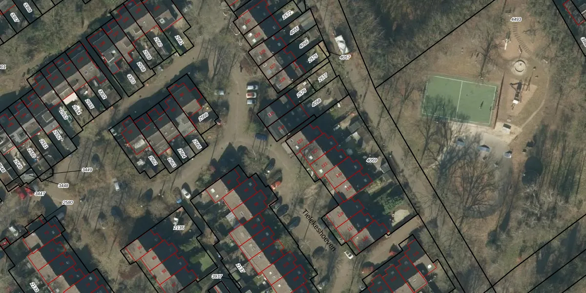 Het perceel waarop Tielekeshoeven 123 staat heeft een oppervlakte van 1204 m². Dit is een zeer groot perceel. De perceeloppervlakte wordt geregistreerd door het Kadaster. Gedetailleerde informatie over de maten van dit perceel kunt u vinden in het rapport Kadastrale kaart met maatvoering van Tielekeshoeven 123.