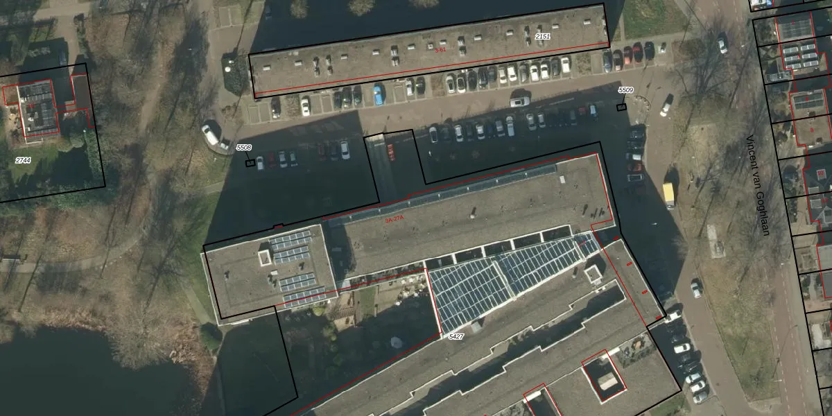 Het perceel waarop Vincent van Goghlaan 1-R staat heeft een oppervlakte van 7250 m². Dit is een zeer groot perceel. De perceeloppervlakte wordt geregistreerd door het Kadaster. Gedetailleerde informatie over de maten van dit perceel kunt u vinden in het rapport Kadastrale kaart met maatvoering van Vincent van Goghlaan 1-R.