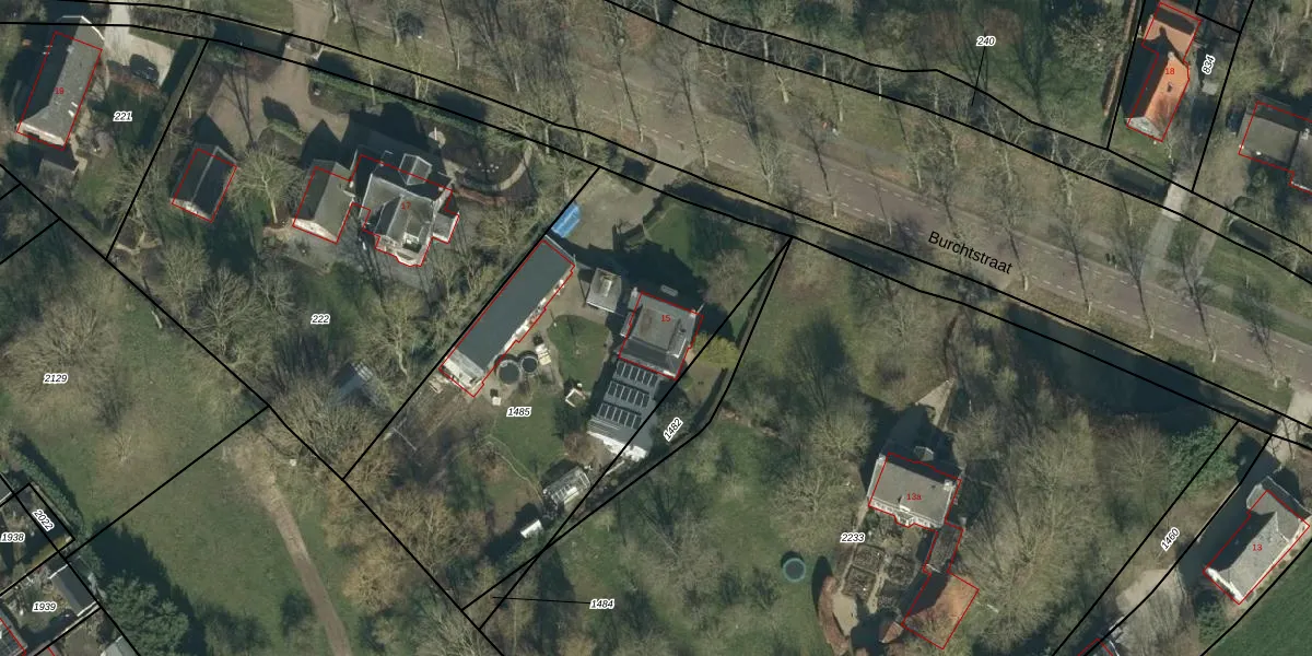 Het perceel waarop Burchtstraat 15 staat heeft een oppervlakte van 2072 m². Dit is een zeer groot perceel. De perceeloppervlakte wordt geregistreerd door het Kadaster. Gedetailleerde informatie over de maten van dit perceel kunt u vinden in het rapport Kadastrale kaart met maatvoering van Burchtstraat 15.