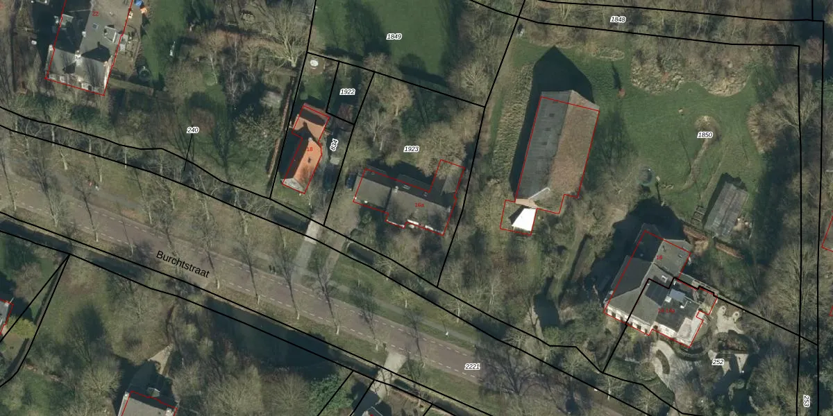 Het perceel waarop Burchtstraat 16-a staat heeft een oppervlakte van 1223 m². Dit is een zeer groot perceel. De perceeloppervlakte wordt geregistreerd door het Kadaster. Gedetailleerde informatie over de maten van dit perceel kunt u vinden in het rapport Kadastrale kaart met maatvoering van Burchtstraat 16-a.