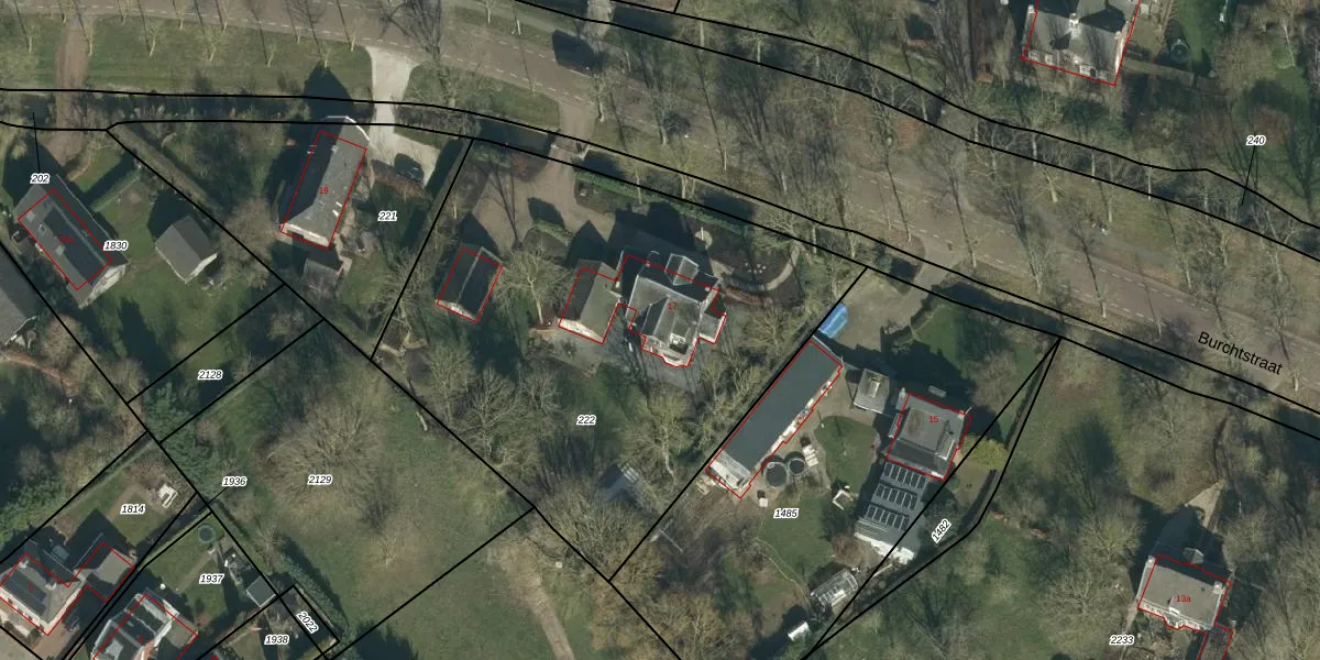 Het perceel waarop Burchtstraat 17 staat heeft een oppervlakte van 2680 m². Dit is een zeer groot perceel. De perceeloppervlakte wordt geregistreerd door het Kadaster. Gedetailleerde informatie over de maten van dit perceel kunt u vinden in het rapport Kadastrale kaart met maatvoering van Burchtstraat 17.