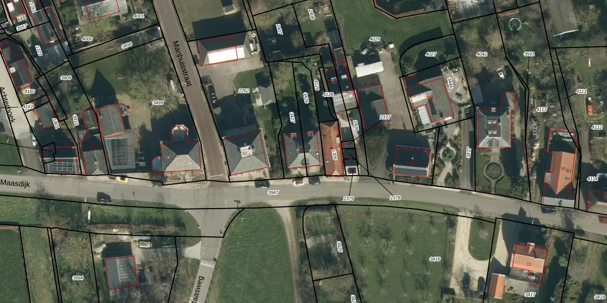 Maasdijk 48 is gelegen op kadastraal perceel RSM00B3427. Deze kadastrale aanduiding is uniek en wordt gebruikt door het Kadaster om eigendomsrechten en andere zakelijke rechten vast te leggen. Het perceel maakt onderdeel uit van de kadastrale gemeente Rossum.