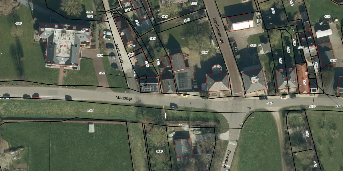 Maasdijk 56 is gelegen op kadastraal perceel RSM00B3910. Deze kadastrale aanduiding is uniek en wordt gebruikt door het Kadaster om eigendomsrechten en andere zakelijke rechten vast te leggen. Het perceel maakt onderdeel uit van de kadastrale gemeente Rossum.