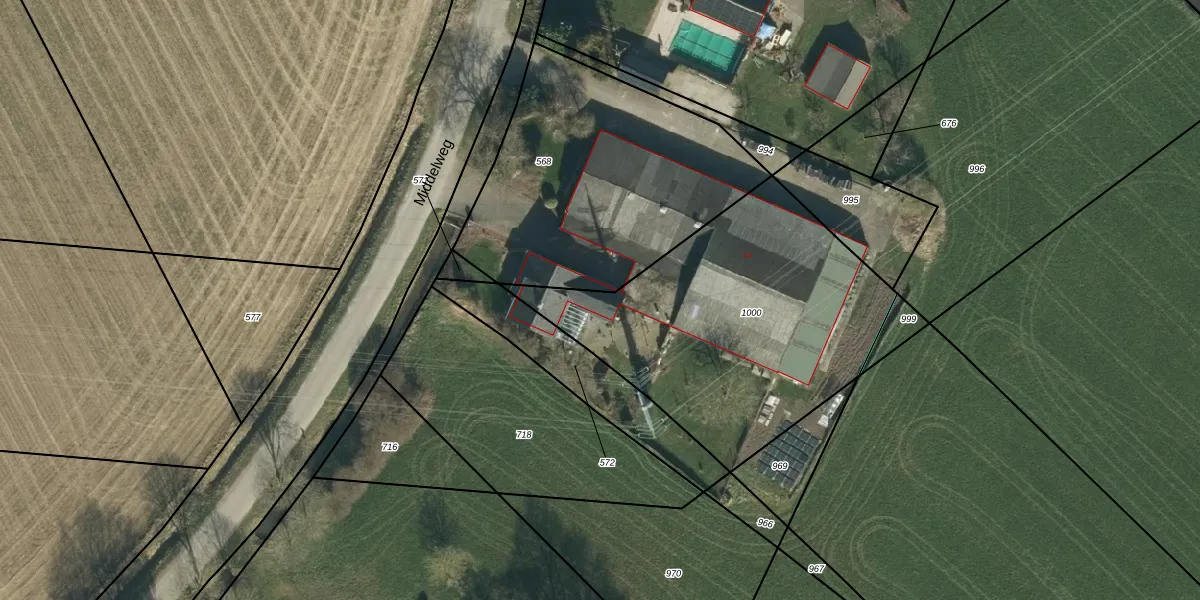Het perceel waarop Middelweg 1-a staat heeft een oppervlakte van 1502 m². Dit is een zeer groot perceel. De perceeloppervlakte wordt geregistreerd door het Kadaster. Gedetailleerde informatie over de maten van dit perceel kunt u vinden in het rapport Kadastrale kaart met maatvoering van Middelweg 1-a.
