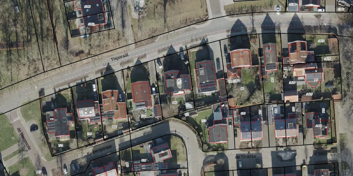 Het perceel waarop Thijstraat 39 staat heeft een oppervlakte van 660 m². Dit is een groot perceel. De perceeloppervlakte wordt geregistreerd door het Kadaster. Gedetailleerde informatie over de maten van dit perceel kunt u vinden in het rapport Kadastrale kaart met maatvoering van Thijstraat 39.