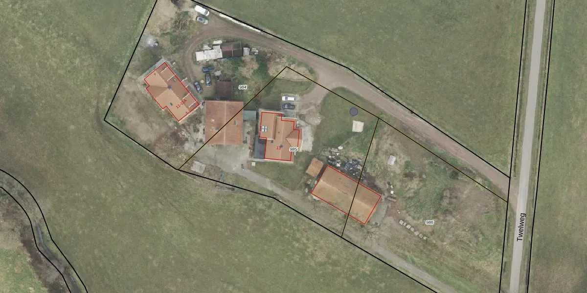 Twelweg 13 is gelegen op kadastraal perceel WSL02U985. Deze kadastrale aanduiding is uniek en wordt gebruikt door het Kadaster om eigendomsrechten en andere zakelijke rechten vast te leggen. Het perceel maakt onderdeel uit van de kadastrale gemeente Weerselo.