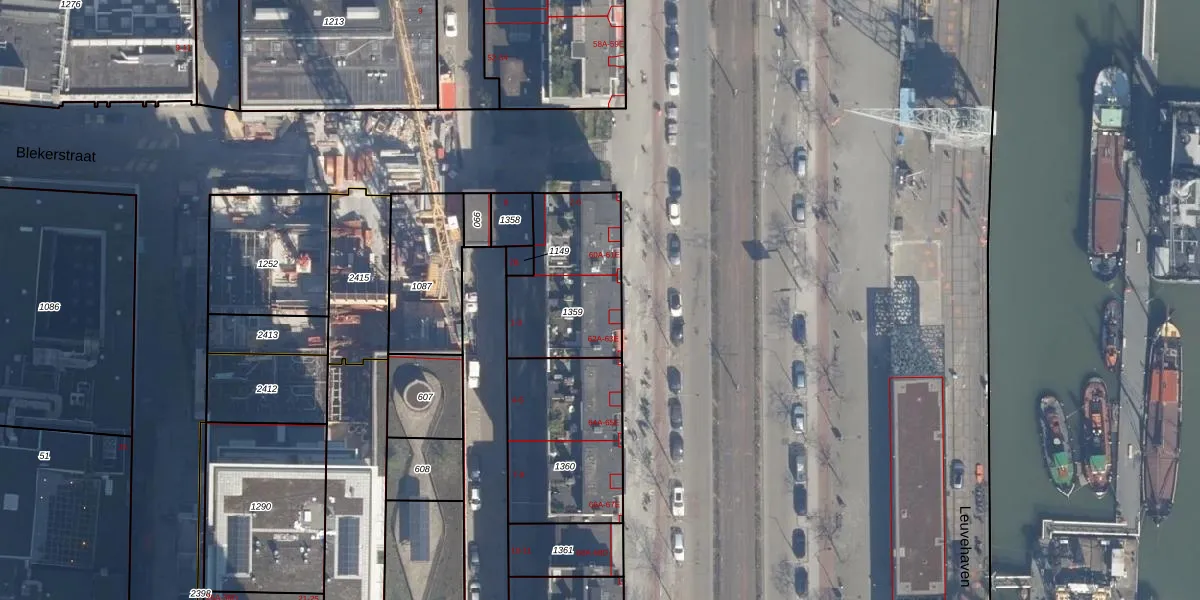 1e Blekerhof 1 is gelegen op kadastraal perceel RTD04AG1359. Deze kadastrale aanduiding is uniek en wordt gebruikt door het Kadaster om eigendomsrechten en andere zakelijke rechten vast te leggen. Het perceel maakt onderdeel uit van de kadastrale gemeente Rotterdam.