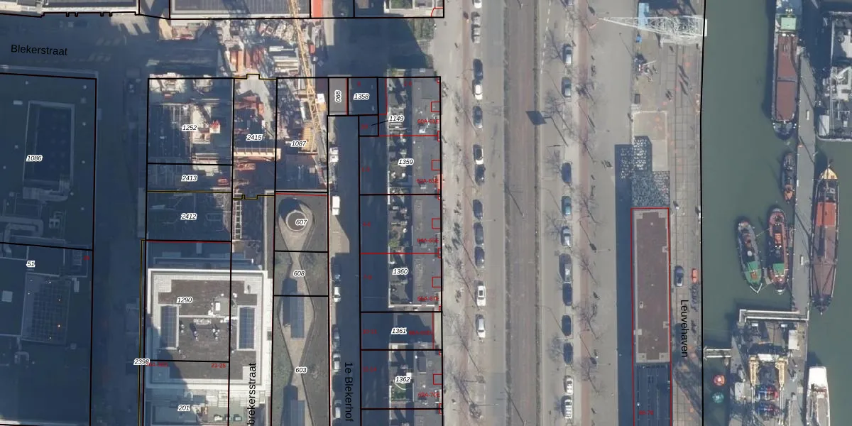 1e Blekerhof 5 is gelegen op kadastraal perceel RTD04AG1360. Deze kadastrale aanduiding is uniek en wordt gebruikt door het Kadaster om eigendomsrechten en andere zakelijke rechten vast te leggen. Het perceel maakt onderdeel uit van de kadastrale gemeente Rotterdam.