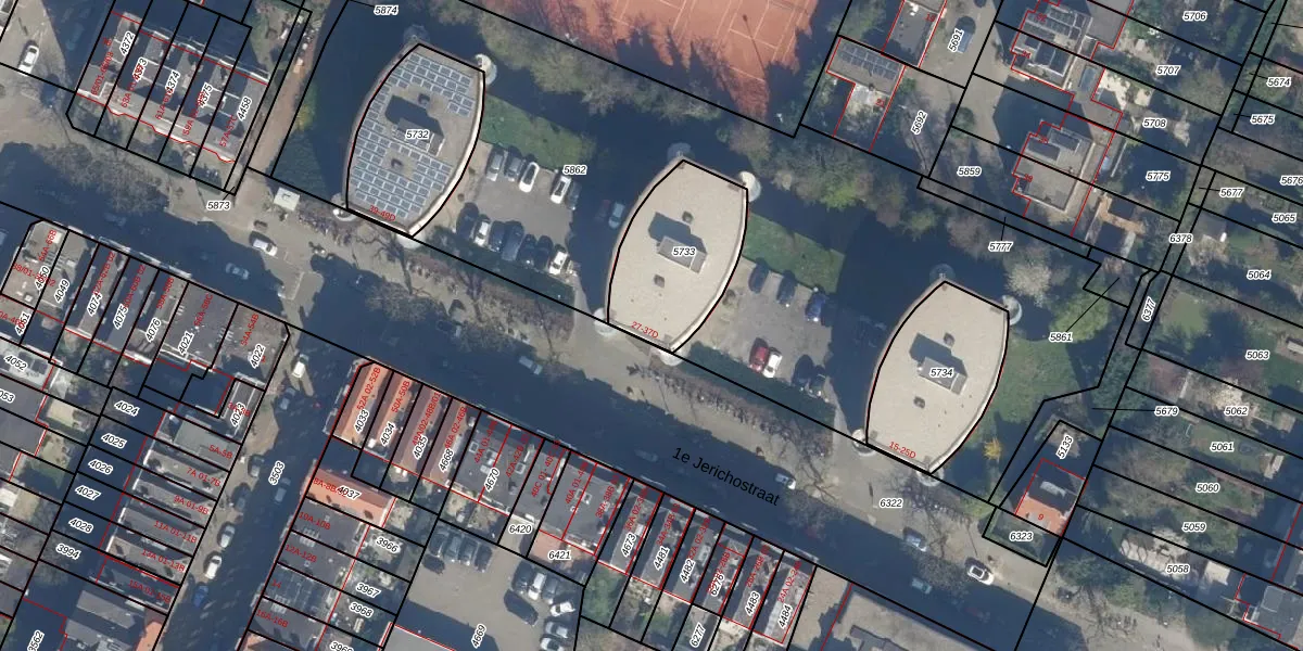 Het perceel waarop 1e Jerichostraat 27 staat heeft een oppervlakte van 433 m². Dit is een groot perceel. De perceeloppervlakte wordt geregistreerd door het Kadaster. Gedetailleerde informatie over de maten van dit perceel kunt u vinden in het rapport Kadastrale kaart met maatvoering van 1e Jerichostraat 27.