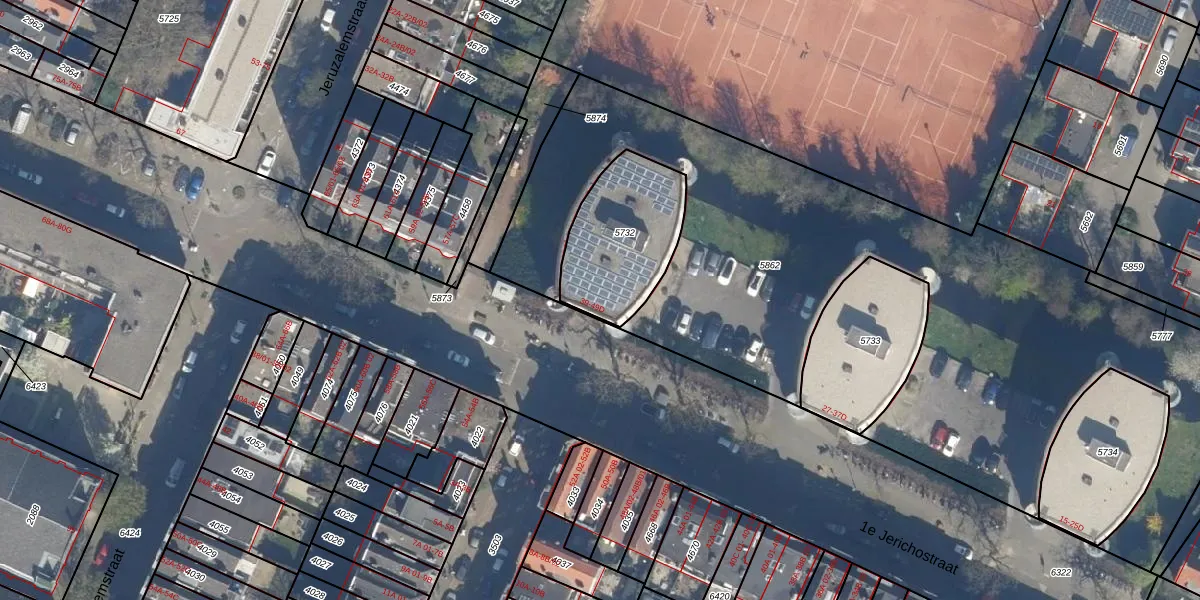 Het perceel waarop 1e Jerichostraat 49-D staat heeft een oppervlakte van 433 m². Dit is een groot perceel. De perceeloppervlakte wordt geregistreerd door het Kadaster. Gedetailleerde informatie over de maten van dit perceel kunt u vinden in het rapport Kadastrale kaart met maatvoering van 1e Jerichostraat 49-D.