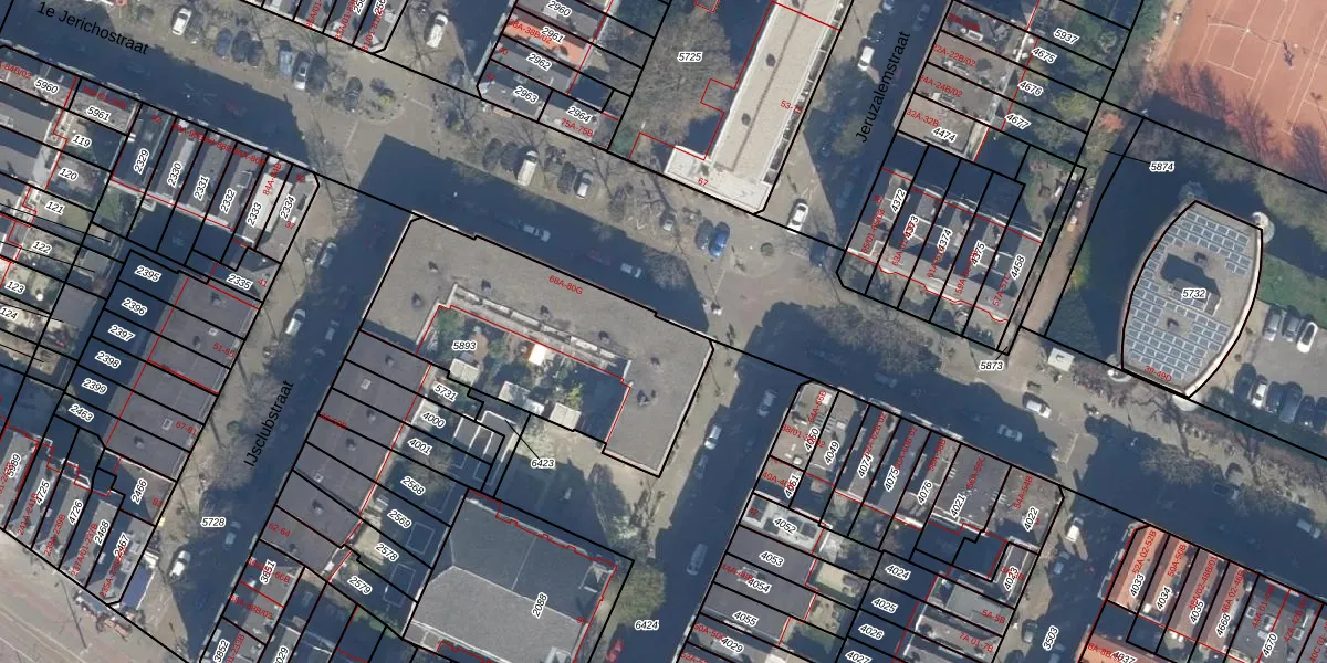 Het perceel waarop 1e Jerichostraat 68-B staat heeft een oppervlakte van 1041 m². Dit is een zeer groot perceel. De perceeloppervlakte wordt geregistreerd door het Kadaster. Gedetailleerde informatie over de maten van dit perceel kunt u vinden in het rapport Kadastrale kaart met maatvoering van 1e Jerichostraat 68-B.