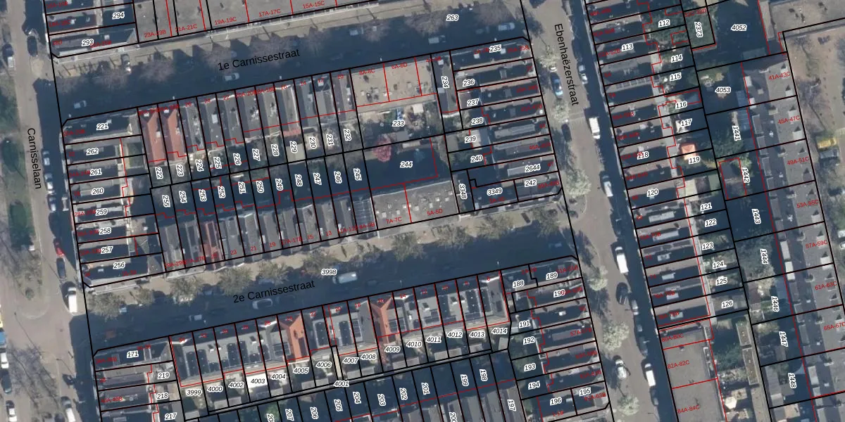 2e Carnissestraat 5-A is gelegen op kadastraal perceel CLS00H244. Deze kadastrale aanduiding is uniek en wordt gebruikt door het Kadaster om eigendomsrechten en andere zakelijke rechten vast te leggen. Het perceel maakt onderdeel uit van de kadastrale gemeente Charlois.