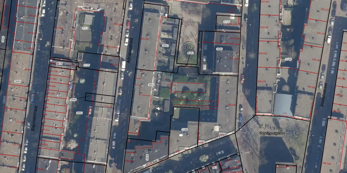 Adrianastraat 206 is gelegen op kadastraal perceel DHV00D3853. Deze kadastrale aanduiding is uniek en wordt gebruikt door het Kadaster om eigendomsrechten en andere zakelijke rechten vast te leggen. Het perceel maakt onderdeel uit van de kadastrale gemeente Delfshaven.
