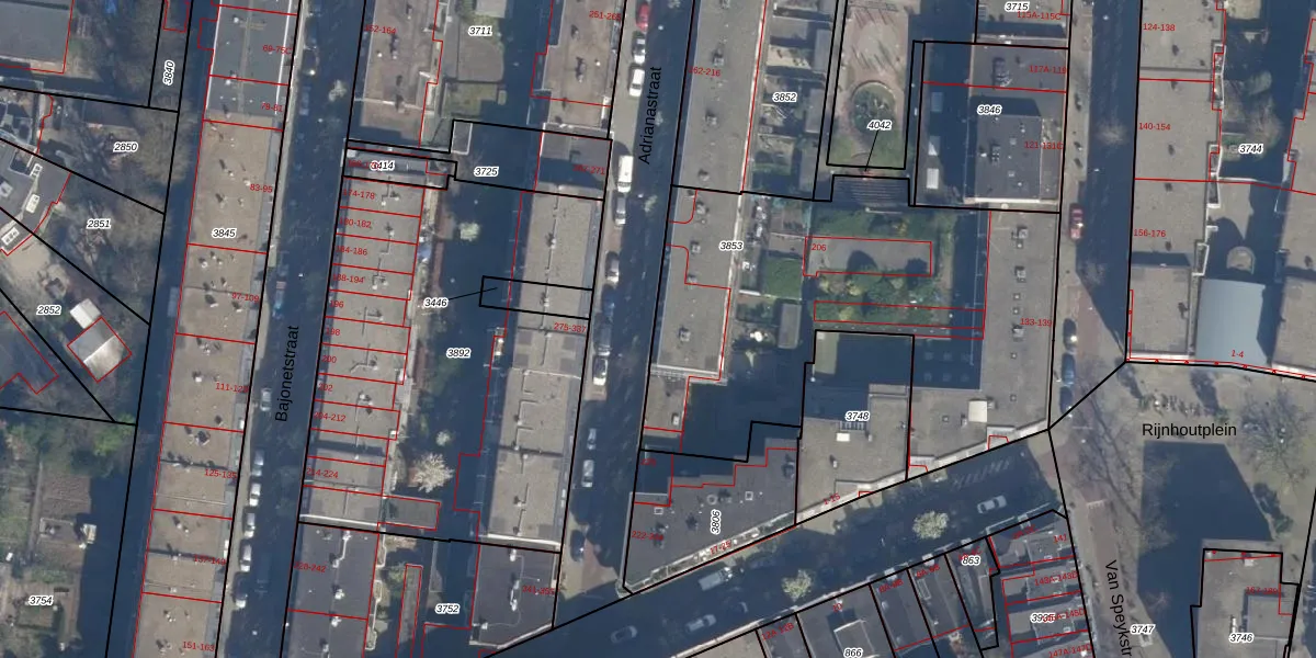 Adrianastraat 212 is gelegen op kadastraal perceel DHV00D3853. Deze kadastrale aanduiding is uniek en wordt gebruikt door het Kadaster om eigendomsrechten en andere zakelijke rechten vast te leggen. Het perceel maakt onderdeel uit van de kadastrale gemeente Delfshaven.