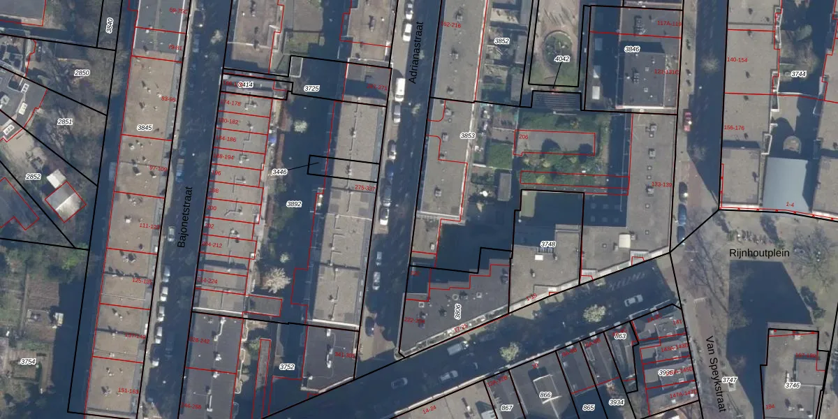 Adrianastraat 214 is gelegen op kadastraal perceel DHV00D3853. Deze kadastrale aanduiding is uniek en wordt gebruikt door het Kadaster om eigendomsrechten en andere zakelijke rechten vast te leggen. Het perceel maakt onderdeel uit van de kadastrale gemeente Delfshaven.