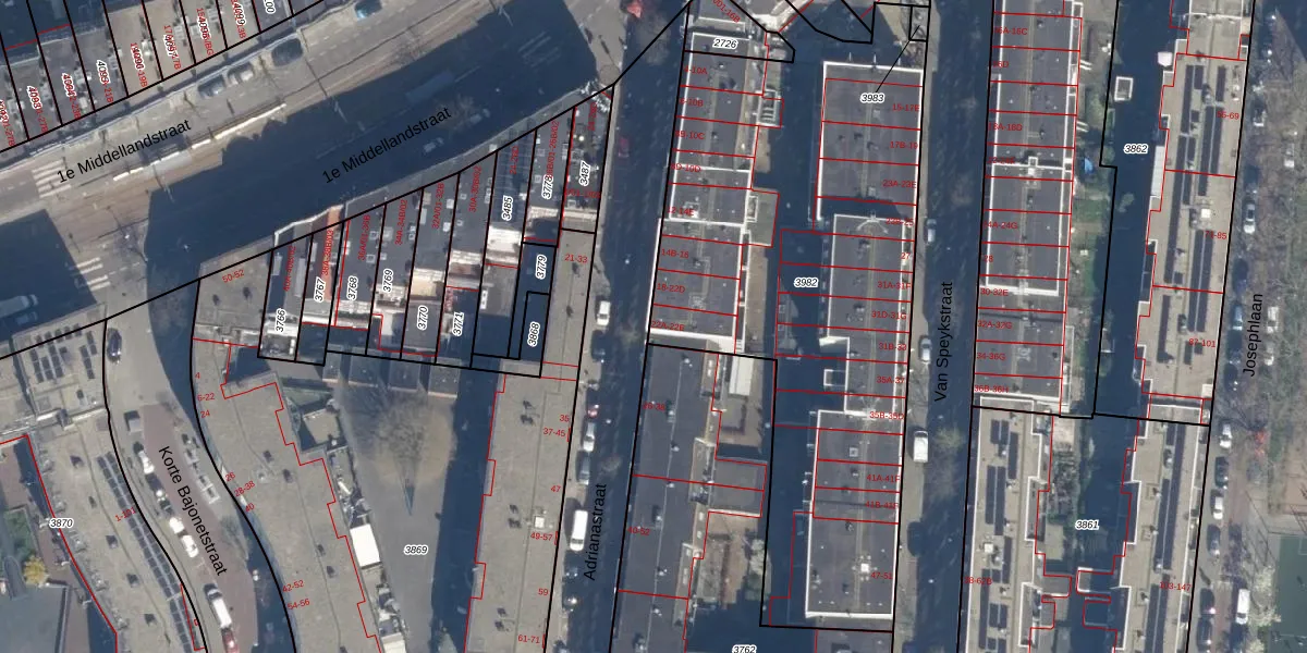 Het perceel waarop Adrianastraat 22-A staat heeft een oppervlakte van 2781 m². Dit is een zeer groot perceel. De perceeloppervlakte wordt geregistreerd door het Kadaster. Gedetailleerde informatie over de maten van dit perceel kunt u vinden in het rapport Kadastrale kaart met maatvoering van Adrianastraat 22-A.