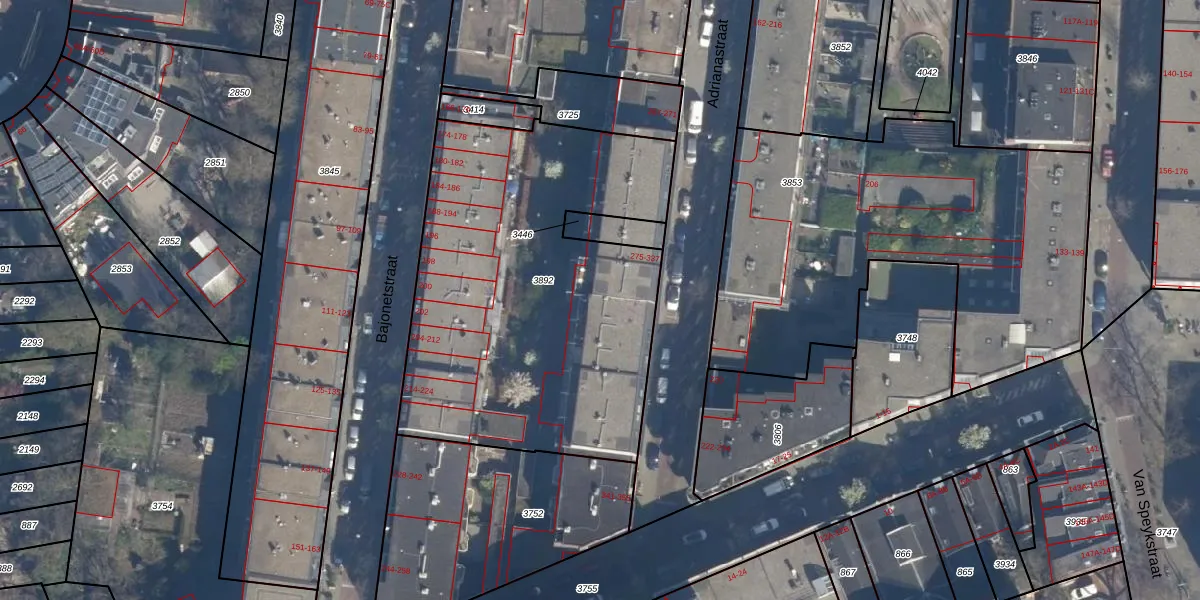 Het perceel waarop Adrianastraat 299 staat heeft een oppervlakte van 2064 m². Dit is een zeer groot perceel. De perceeloppervlakte wordt geregistreerd door het Kadaster. Gedetailleerde informatie over de maten van dit perceel kunt u vinden in het rapport Kadastrale kaart met maatvoering van Adrianastraat 299.