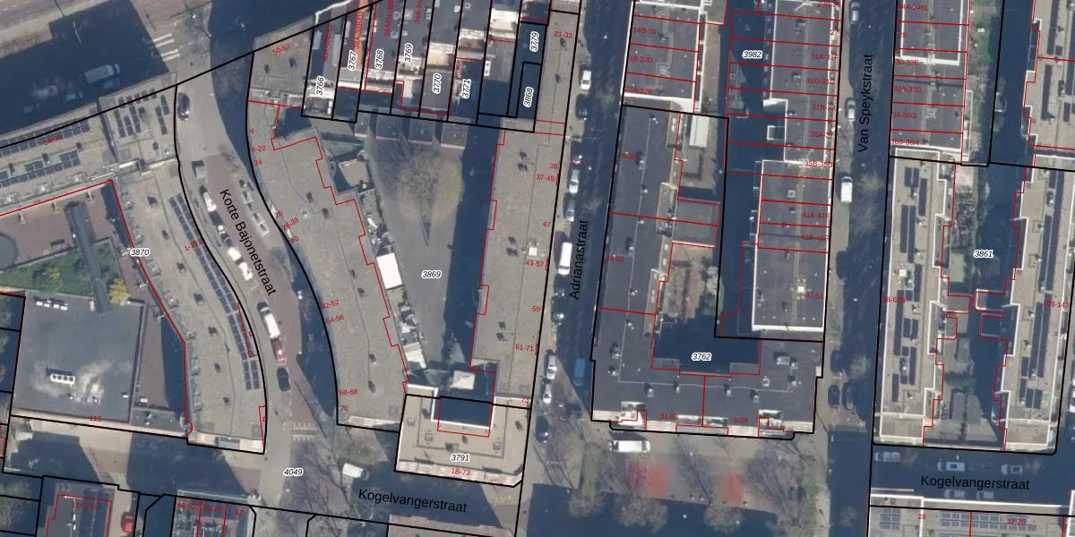 Adrianastraat 49 is gelegen op kadastraal perceel DHV00D3869. Deze kadastrale aanduiding is uniek en wordt gebruikt door het Kadaster om eigendomsrechten en andere zakelijke rechten vast te leggen. Het perceel maakt onderdeel uit van de kadastrale gemeente Delfshaven.