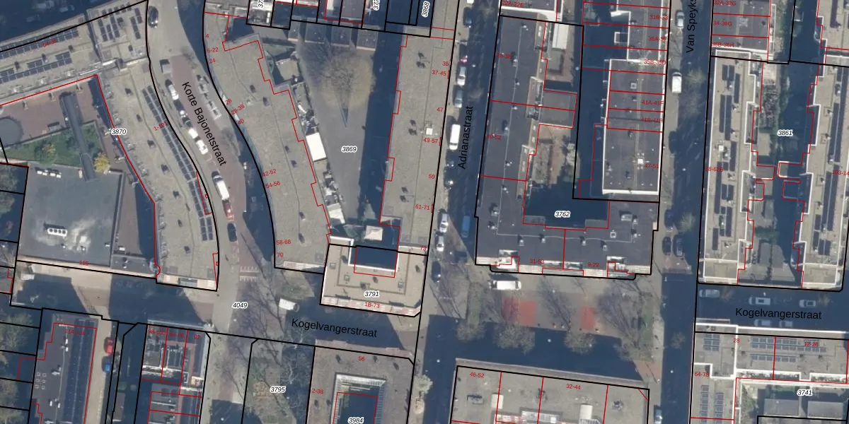 Het perceel waarop Adrianastraat 63 staat heeft een oppervlakte van 2810 m². Dit is een zeer groot perceel. De perceeloppervlakte wordt geregistreerd door het Kadaster. Gedetailleerde informatie over de maten van dit perceel kunt u vinden in het rapport Kadastrale kaart met maatvoering van Adrianastraat 63.