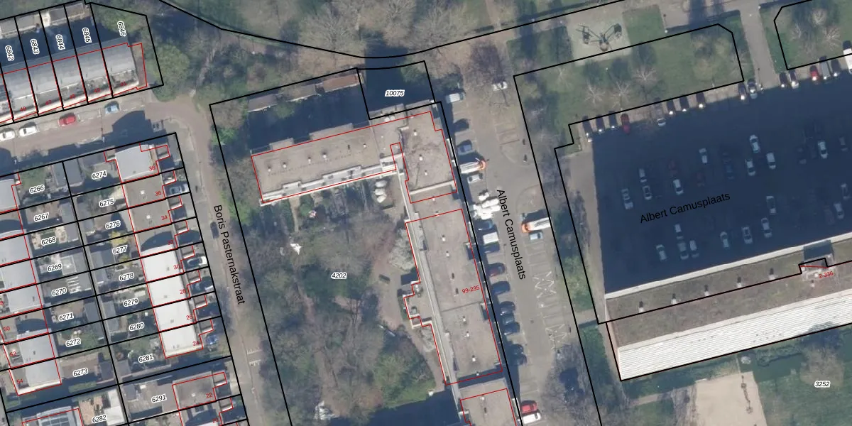 Het perceel waarop Albert Camusplaats 145 staat heeft een oppervlakte van 5575 m². Dit is een zeer groot perceel. De perceeloppervlakte wordt geregistreerd door het Kadaster. Gedetailleerde informatie over de maten van dit perceel kunt u vinden in het rapport Kadastrale kaart met maatvoering van Albert Camusplaats 145.