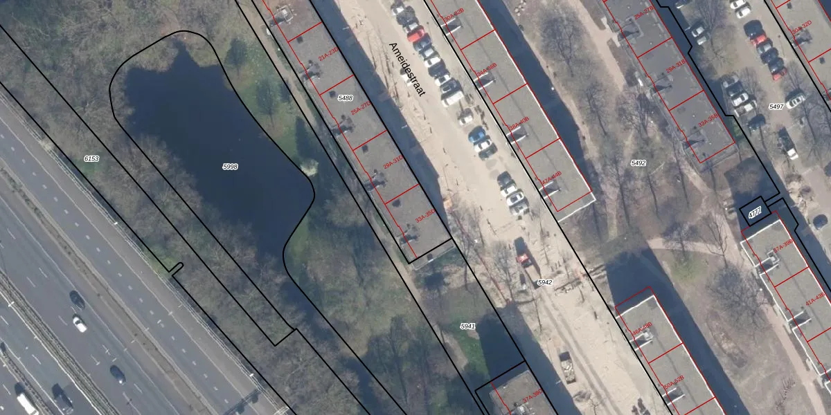 Ameidestraat 33-D is gelegen op kadastraal perceel OVS00C5488. Deze kadastrale aanduiding is uniek en wordt gebruikt door het Kadaster om eigendomsrechten en andere zakelijke rechten vast te leggen. Het perceel maakt onderdeel uit van de kadastrale gemeente Overschie.