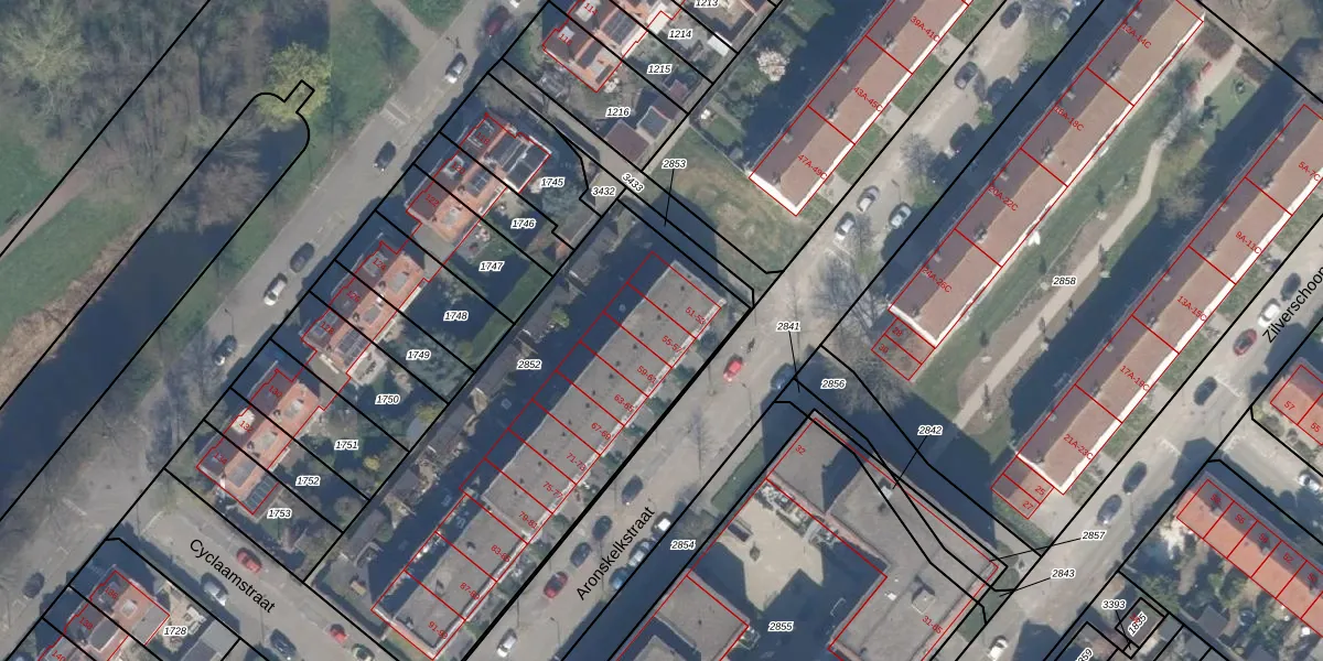 Het perceel waarop Aronskelkstraat 57 staat heeft een oppervlakte van 1968 m². Dit is een zeer groot perceel. De perceeloppervlakte wordt geregistreerd door het Kadaster. Gedetailleerde informatie over de maten van dit perceel kunt u vinden in het rapport Kadastrale kaart met maatvoering van Aronskelkstraat 57.