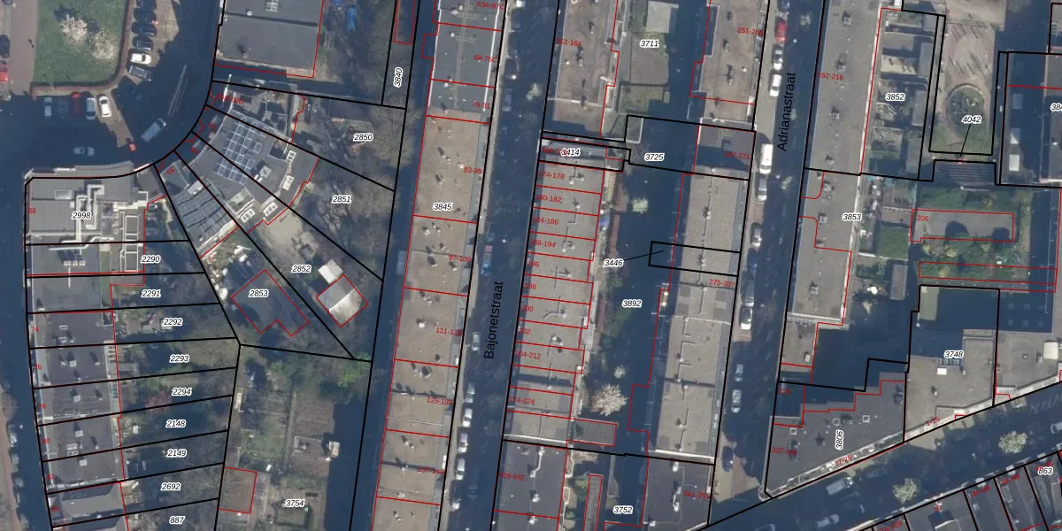 Het perceel waarop Bajonetstraat 190 staat heeft een oppervlakte van 2064 m². Dit is een zeer groot perceel. De perceeloppervlakte wordt geregistreerd door het Kadaster. Gedetailleerde informatie over de maten van dit perceel kunt u vinden in het rapport Kadastrale kaart met maatvoering van Bajonetstraat 190.
