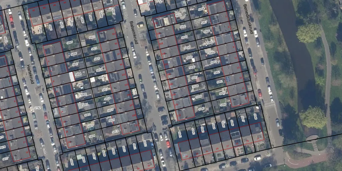Het perceel waarop Balsemkruid 166 staat heeft een oppervlakte van 156 m². Dit is een middelgroot perceel. De perceeloppervlakte wordt geregistreerd door het Kadaster. Gedetailleerde informatie over de maten van dit perceel kunt u vinden in het rapport Kadastrale kaart met maatvoering van Balsemkruid 166.