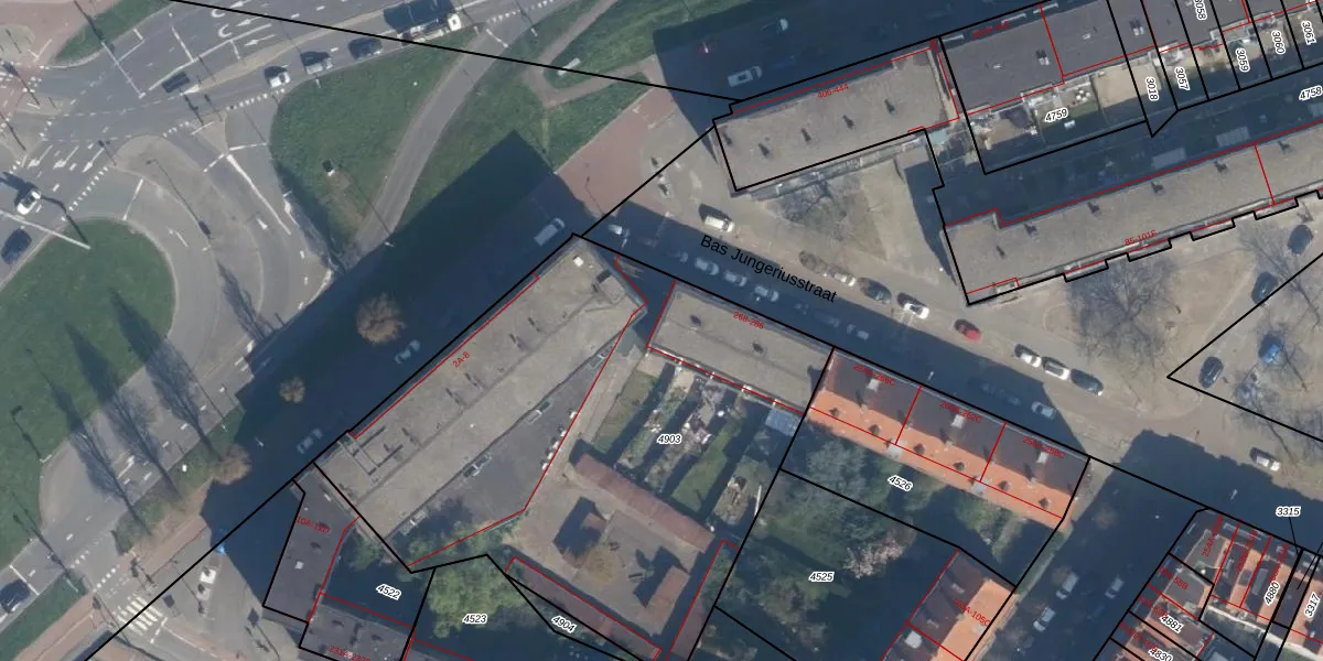 Bas Jungeriusstraat 284 is gelegen op kadastraal perceel CLS00E4903. Deze kadastrale aanduiding is uniek en wordt gebruikt door het Kadaster om eigendomsrechten en andere zakelijke rechten vast te leggen. Het perceel maakt onderdeel uit van de kadastrale gemeente Charlois.