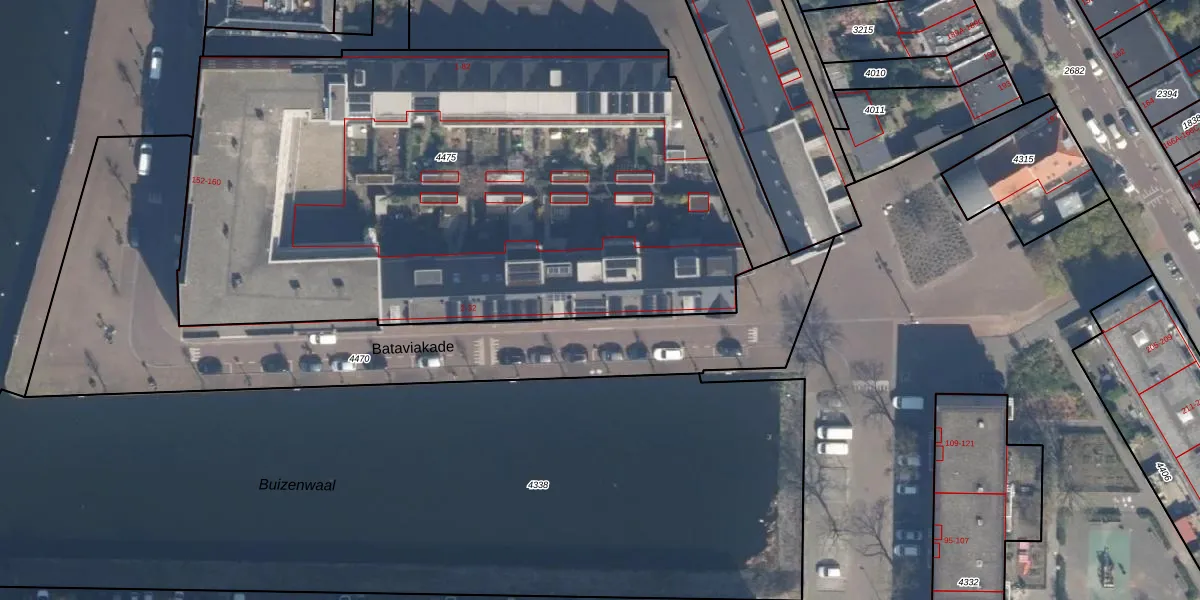 Bataviakade 12 is gelegen op kadastraal perceel DHV00A4475. Deze kadastrale aanduiding is uniek en wordt gebruikt door het Kadaster om eigendomsrechten en andere zakelijke rechten vast te leggen. Het perceel maakt onderdeel uit van de kadastrale gemeente Delfshaven.