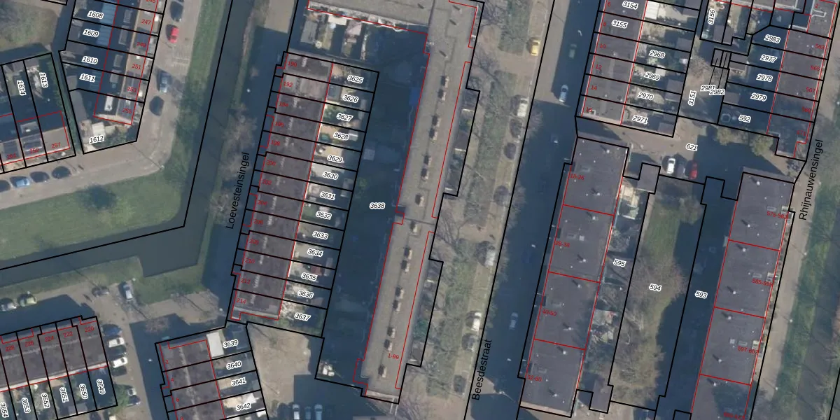 Beesdestraat 63 is gelegen op kadastraal perceel ISM01F3638. Deze kadastrale aanduiding is uniek en wordt gebruikt door het Kadaster om eigendomsrechten en andere zakelijke rechten vast te leggen. Het perceel maakt onderdeel uit van de kadastrale gemeente IJsselmonde.