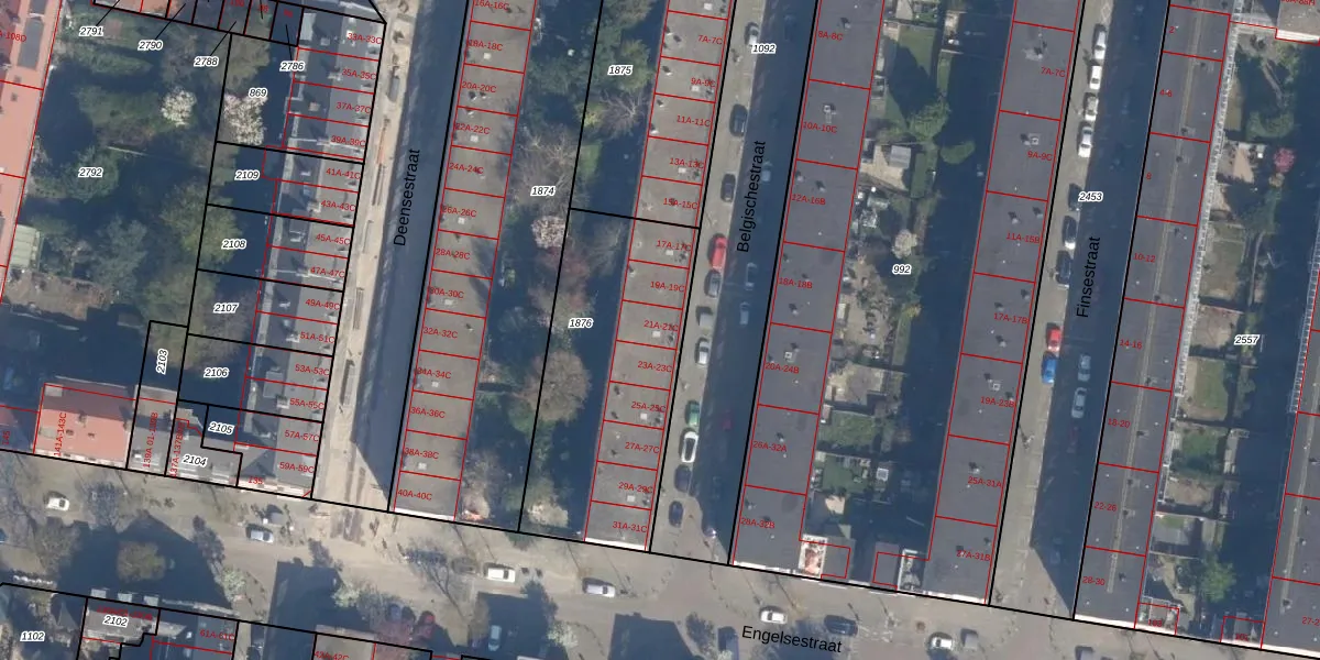 Het perceel waarop Belgischestraat 21-B staat heeft een oppervlakte van 1007 m². Dit is een zeer groot perceel. De perceeloppervlakte wordt geregistreerd door het Kadaster. Gedetailleerde informatie over de maten van dit perceel kunt u vinden in het rapport Kadastrale kaart met maatvoering van Belgischestraat 21-B.