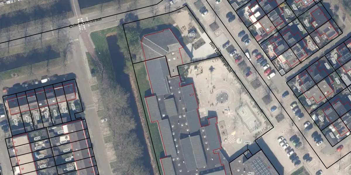 Het perceel waarop Ben Websterstraat 11 staat heeft een oppervlakte van 4341 m². Dit is een zeer groot perceel. De perceeloppervlakte wordt geregistreerd door het Kadaster. Gedetailleerde informatie over de maten van dit perceel kunt u vinden in het rapport Kadastrale kaart met maatvoering van Ben Websterstraat 11.