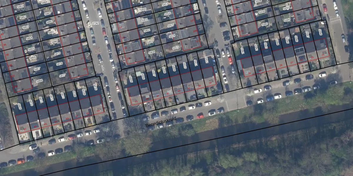Benedictuskruid 43 is gelegen op kadastraal perceel HLG03B5909. Deze kadastrale aanduiding is uniek en wordt gebruikt door het Kadaster om eigendomsrechten en andere zakelijke rechten vast te leggen. Het perceel maakt onderdeel uit van de kadastrale gemeente Hillegersberg.