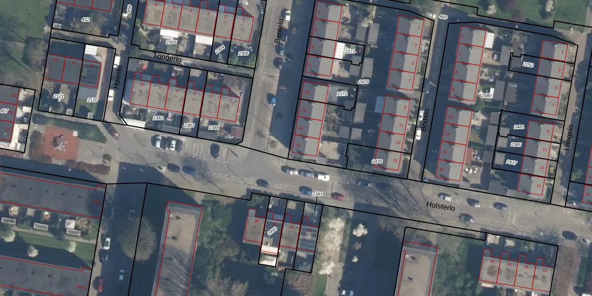 Het perceel waarop Bentelo 16 staat heeft een oppervlakte van 1851 m². Dit is een zeer groot perceel. De perceeloppervlakte wordt geregistreerd door het Kadaster. Gedetailleerde informatie over de maten van dit perceel kunt u vinden in het rapport Kadastrale kaart met maatvoering van Bentelo 16.
