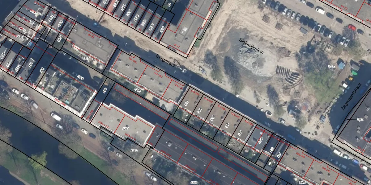 Bergstraat 72-A is gelegen op kadastraal perceel RTD08X5260. Deze kadastrale aanduiding is uniek en wordt gebruikt door het Kadaster om eigendomsrechten en andere zakelijke rechten vast te leggen. Het perceel maakt onderdeel uit van de kadastrale gemeente Rotterdam.