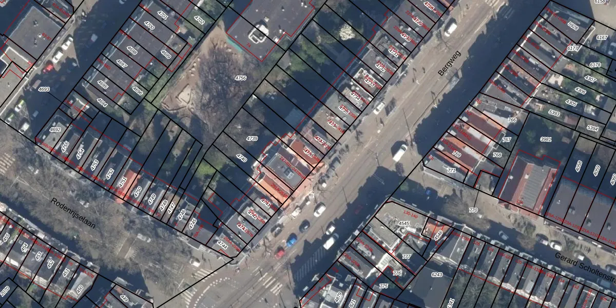 Bergweg 245-B is gelegen op kadastraal perceel RTD09Y4738. Deze kadastrale aanduiding is uniek en wordt gebruikt door het Kadaster om eigendomsrechten en andere zakelijke rechten vast te leggen. Het perceel maakt onderdeel uit van de kadastrale gemeente Rotterdam.
