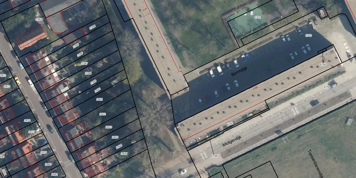 Het perceel waarop Bermdijk 37 staat heeft een oppervlakte van 1,2 ha. Dit is een zeer groot perceel. De perceeloppervlakte wordt geregistreerd door het Kadaster. Gedetailleerde informatie over de maten van dit perceel kunt u vinden in het rapport Kadastrale kaart met maatvoering van Bermdijk 37.