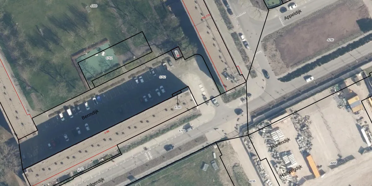 Het perceel waarop Bermdijk 80 staat heeft een oppervlakte van 1280 m². Dit is een zeer groot perceel. De perceeloppervlakte wordt geregistreerd door het Kadaster. Gedetailleerde informatie over de maten van dit perceel kunt u vinden in het rapport Kadastrale kaart met maatvoering van Bermdijk 80.