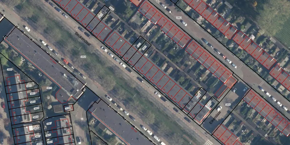 Het perceel waarop Beukendaal 56 staat heeft een oppervlakte van 7512 m². Dit is een zeer groot perceel. De perceeloppervlakte wordt geregistreerd door het Kadaster. Gedetailleerde informatie over de maten van dit perceel kunt u vinden in het rapport Kadastrale kaart met maatvoering van Beukendaal 56.