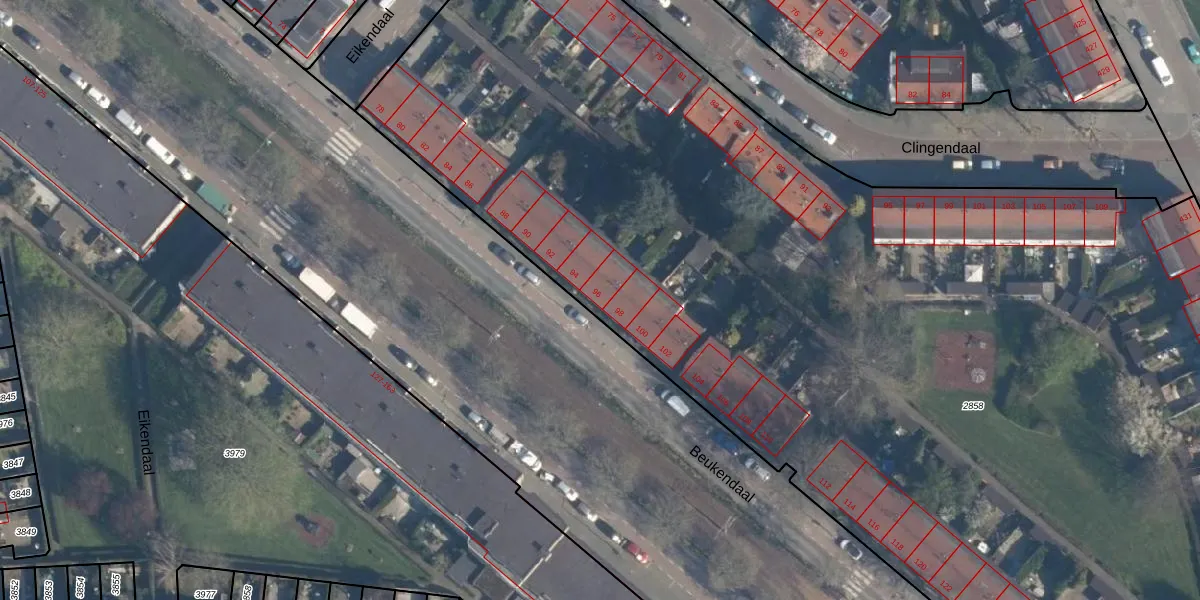 Beukendaal 96 is gelegen op kadastraal perceel RTD05V2858. Deze kadastrale aanduiding is uniek en wordt gebruikt door het Kadaster om eigendomsrechten en andere zakelijke rechten vast te leggen. Het perceel maakt onderdeel uit van de kadastrale gemeente Rotterdam.